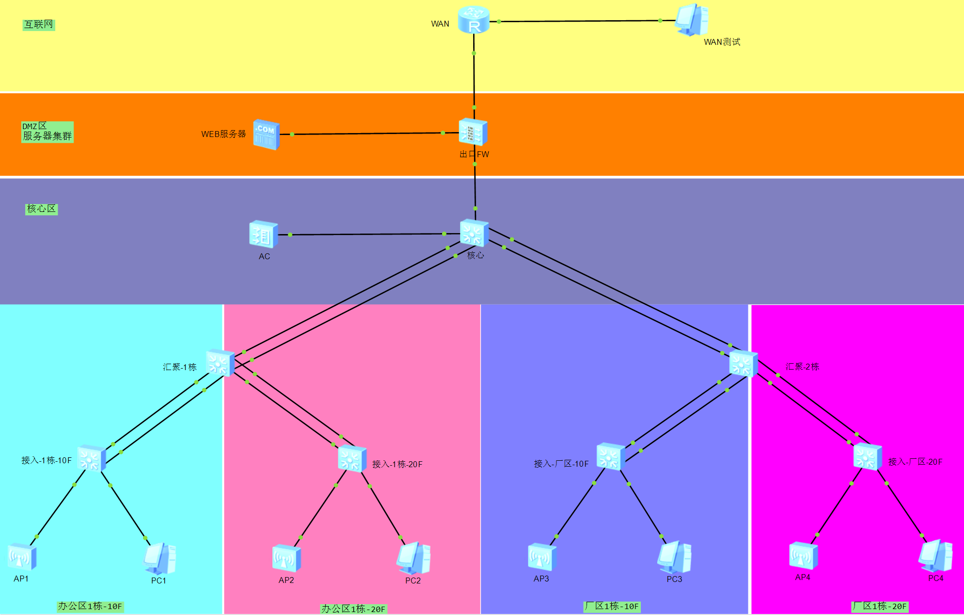 #因内网使用的全在172.16.0.0/16的地址段中,此处直接回指16位大段 #也可以指明细段 [FW-1]ip route-static 172.16.0.0 16 1.1.1.1 #默认路由指向WAN路由器 [FW-1]ip route-static 0.0.0.0 0 200.1.1.1核心交换机