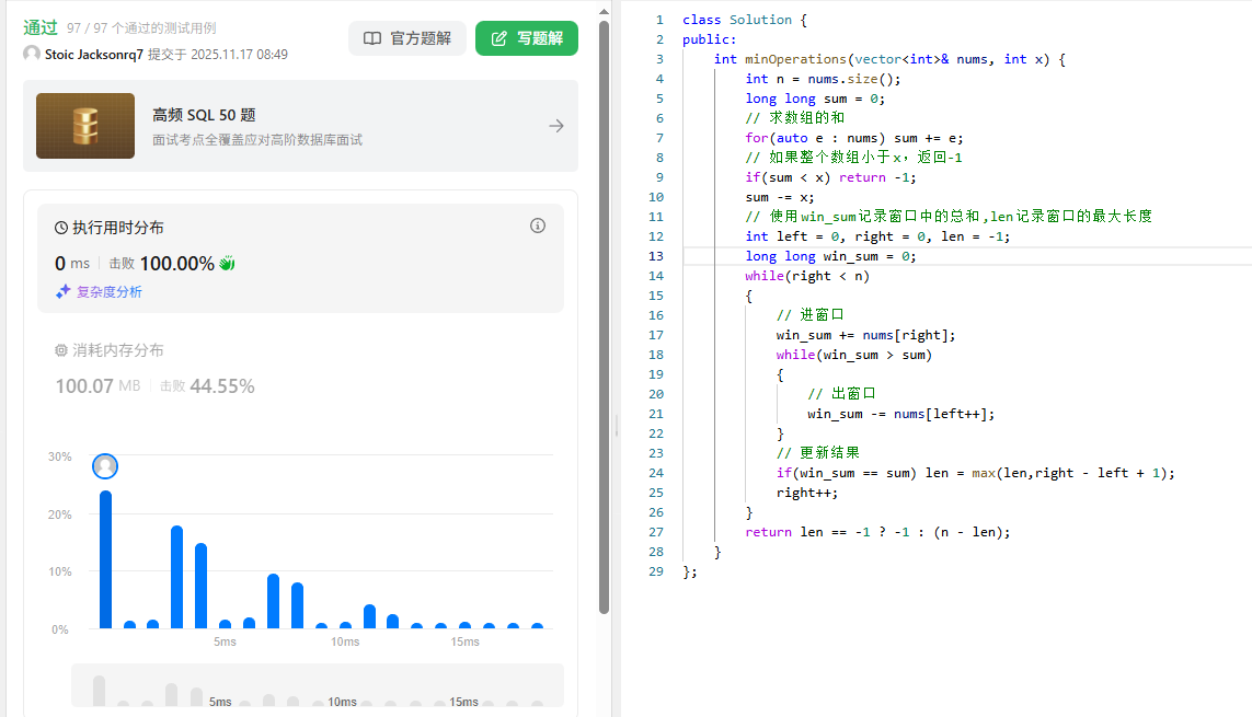 还需要注意的是,我们需要求的是减去x的最小操作数,也就意味着中间那段子数组越长,两边的操作数越小,所以结果更新条件也有了,在末了返回结果的时候需要用n-1中间那段子数组的长度才能得到最终的操作数。