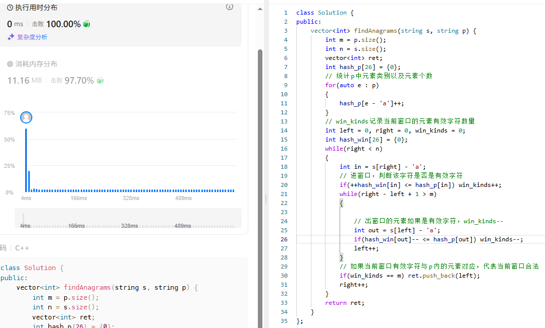 听起来还挺简单的吧,但是该题目与上面那个水果篮子不同的点在于,我们需要比较当前窗口与p中的所有元素,于是我们需要每次进窗口以后比较一下这个字符个数是否小于等于p中的元素个数,倘若是那么此次插入的个数是有效字符,win_kinds++。当窗口中的有效字符等于p中的元素个数,更新结果。