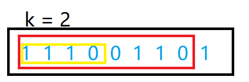 通过这里用count统计了窗口0的数量,所以无论0在哪个位置,只要count>k那么这个区间就不合法,我们需一直从左边开始出窗口直到合法。在下面这个示例中,当窗口为11100110的时候窗口不合法,左边一直出窗口,将1110全部出去以后,剩下的0110窗口才合法。其中的0011这个窗口会被忽略,但是它是具备在1110011区间的,我们要找到地是最长区间,所以能够直接忽略,也没必要去枚举这个区间,它必然不会是最终答案区间。