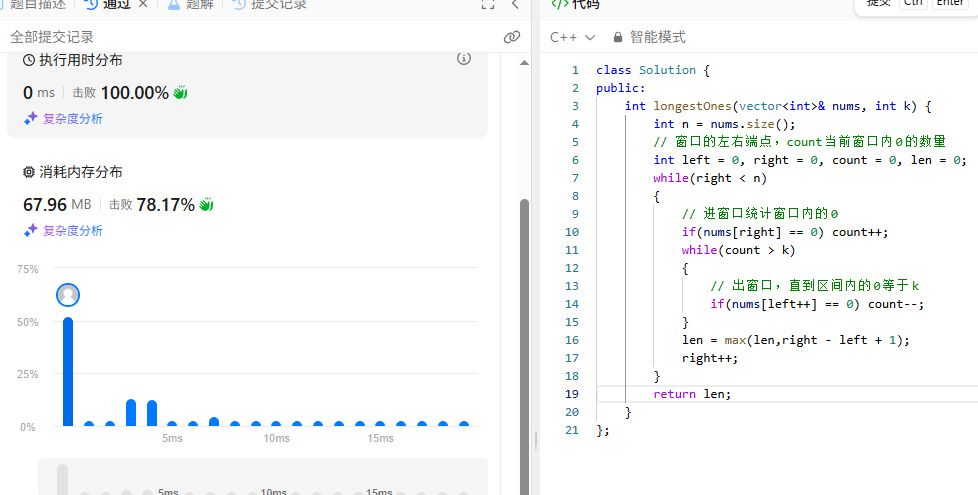 合法的子区间,然后再统计一下合法区间的长度即可。就是优化:题意是求一段连续的区间,并且前面枚举的时候还是会有重叠的区域,那么还是许可利用滑动窗口,但是此时控制这个子数组也就是窗口的大小的其实就是K的值。大家可以在素材进窗口以后统计一下当前0的数量,如果大于K值,那么此时就要出窗口,直到窗口内的0等于K值,因为此时才