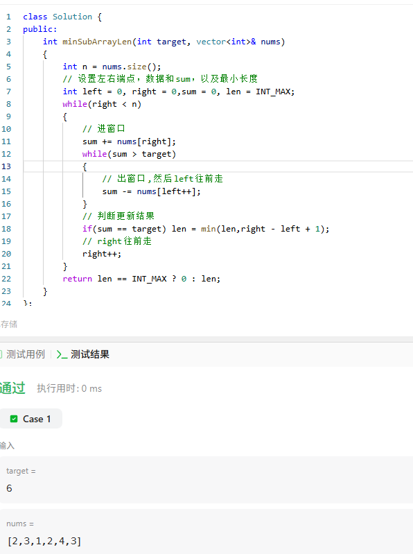 细心的同学应该会发现了,这两次相加有一个重叠的部分,当第二次相加的时候再重头开始相加好像有点多次一举了,大家可以用第一次得到的和减去前一个起点,而不用从头开始继续相加,减去一个数的该操作叫做出窗口。继而继续加下一个值,这一步叫做进窗口。框中的那个部分就是窗口,在近窗口以后需对其中的数据和进行判断,如果大于目标值就需出窗口,基于我们需要将窗口等于目标值。实际上在滑动的时候应该是2 + 3 + 1 + 2 = 8,此时大于6,需要一直减去左边的值出窗口,直到窗口内的数据和不再大于目标值。结束出窗口以后需要判断此时窗口内的值是否等于目标值,如果相等就记录长度。此时2出了以后,其中的数据还有3 + 1 + 2 = 6,等于目标值,记录长度。有的同学会问了,那么开始的2 3 1不就错过了,完整的步骤应该是:定义一个left和right,由left来指向出窗口的信息,right指向进窗口的内容,直到right < size的时候循环结束。那么在2 + 3 + 1的时候此时刚好等于目标值,不需要出窗口执行,接着就进入判断结果,符合目标值长度记录,再下一次进窗口以后就需要像上面说的情况出窗口了。