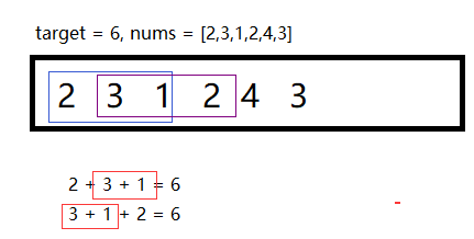 这里使用 target = 6, nums = [2,3,1,2,4,3] 来做示例讲解: