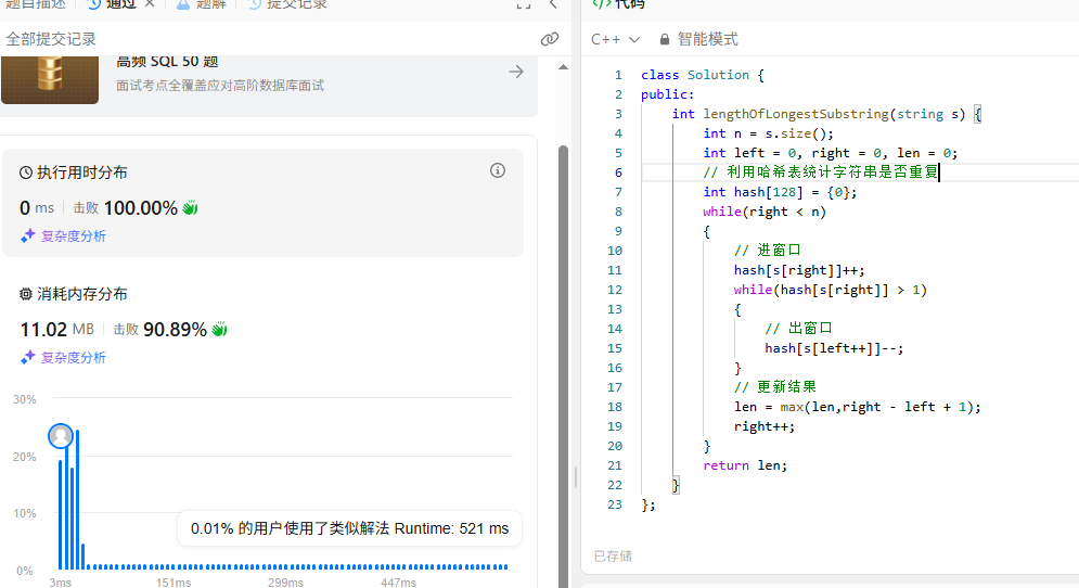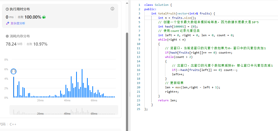 具体代码中我并没有启用unodered_map来储存当前窗口中元素的总类和个数,而是使用了一个数组来模拟,以及利用count记录当前元素总类。当然你也可以启用unodered_map,然后用map.size()来求当前元素的个数,只是map.count()在查找某一个元素的时候会产生额外的时间复杂度,不过map查找的时间复杂度是o(logn),与本题o(n)不是一个量级,也允许忽略不计。