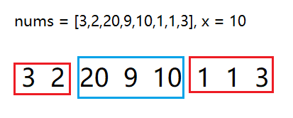 这道题目看起来与滑动窗口没有什么关系,但是通过下面这个例子我们会发现,我们并不需要直接去求出两边到底减多少次,由于这是随机的,我们无法控制。但是我们会发现除了红色框被减去的,中间蓝色框的那部分是连续的。整个数组的和sum = red + blue,而red部分等于x,那么blue部分的值也能够确定了,所以我们就可以通过滑动窗口来求一段连续的子数组,只要这个数组的和等于sum - x即可,这个就是合法窗口的条件。当窗口中的数据大于sum - x那么左边出窗口,当窗口材料和小于sum - x,进窗口。