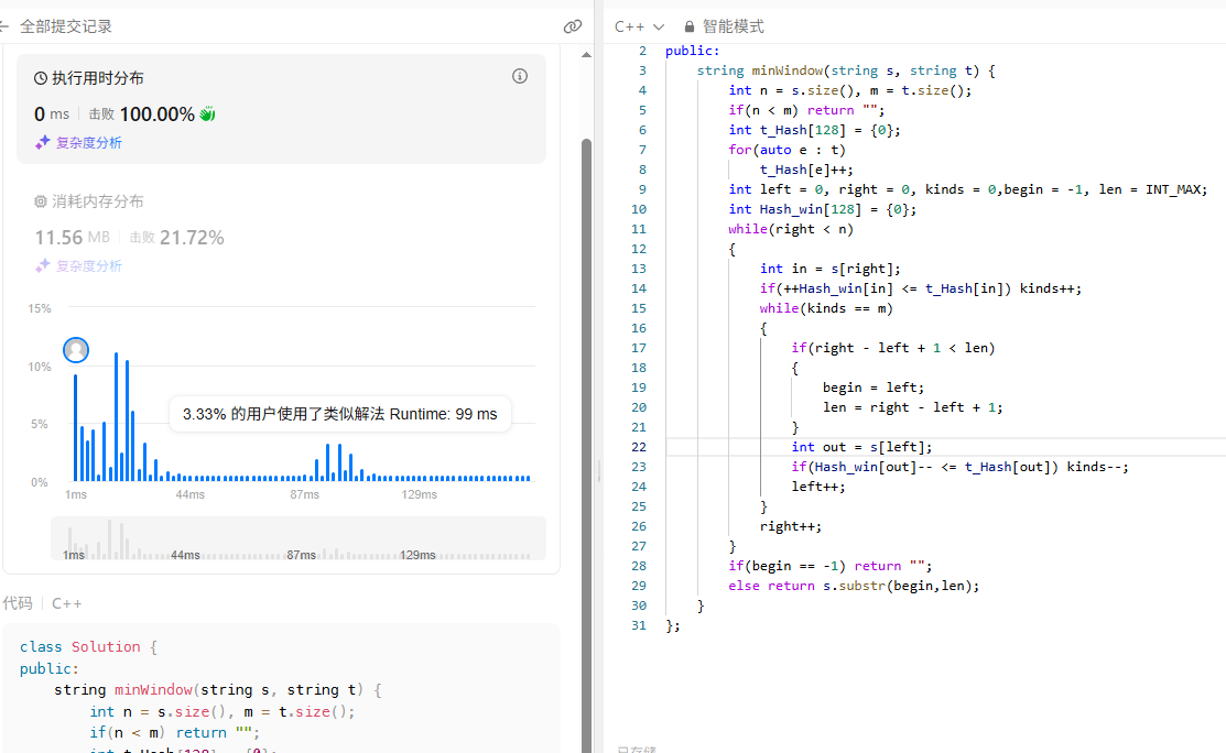 该题目与上面那种题目很接近,只不过此时需要返回的是一个子串,这个子串长度不一定和t的一样,即不是固定的窗口,但是原来大同小异,现在进窗口的条件改为了kinds == m,所以进窗口以后我们就要更新结果,然后再进行窗口的操作。由于出窗口的不一定是有效字符,所以直到kinds < m,才会跳出循环,在这个过程中我们也能找到这个区间中的一个最小子串。例如t = abc,有一段区间abdfgjabc,当窗口为abdfgjabc的时候kinds == m,然后左边一直会出窗口,直到最小的区间abc,再把a移出去,条件不满足循环结束。