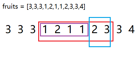 该题目的意思是给定一个fruits数组,在其中找出一段区间内只有两个不同元素的最长子区间。