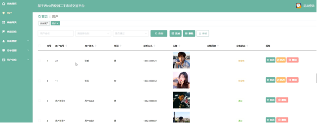 用户信息功能在视图层(view层)进行交互,比如点击“添加”按钮或填写用户信息表单。这些用户信息动作被视图层捕获并作为请求发送给相应的控制器层(control1er层)。控制器接收到这些请求后,调用服务层(service层)以执行相关的业务逻辑,例如验证输入数据的有效性和与数据库的交互。服务层处理完这些逻辑后,进一步与内容访问对象层(DAO层)交互,后者负责具体的素材管理如查询、添加、更新或删除用户信息,并将操作结果返回给控制器。最终,控制器根据这些结果更新视图层,以便用户信息功能可以看到最新的信息或相应的操作反馈。在用户信息页面的输入栏中输入用户姓名、性别、是否通过进行查询,可以查看到用户详细信息,并根据必须进行修改或者删除等操作;如图5-9所示: