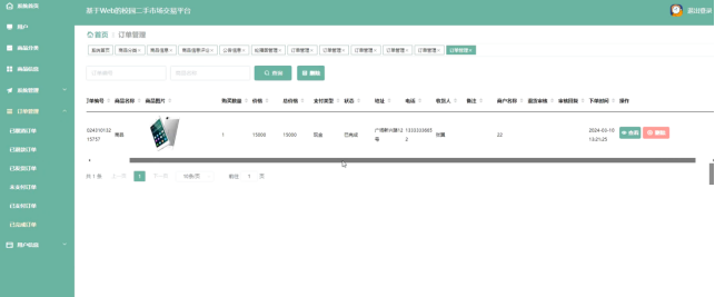 管理员点击订单管理,在订单管理页面对订单编号、商品名称、商品图片、购买数量、价格、总价格、支付类型、状态、地址、电话、收货人、备注、商户名称、退货审核、审核回复、下单时间等信息,可以搜索或删除订单信息等操作。如图5-13所示: