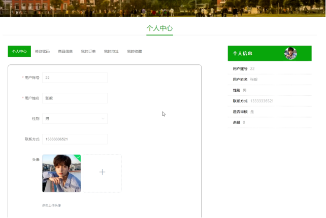 用户点击个人中心,在个人中心页面可以修改个人信息、密码修改,还行对商品信息、我的订单、我的地址、我的收藏进行详细操作,如图5-6所示。