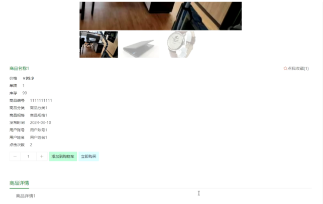 用户点击商品信息,在商品信息页面的搜索栏输入商品名称、价格,进行查询,然后可以查看商品编号、商品名称、商品分类、商品图片、商品规格、发布时间、用户账号、用户姓名、单限、库存、点击次数、评论数、价格、收藏数等信息,如有需要可以添加到购物车、立即购买、收藏或者评论等运行;如图5-4所示。