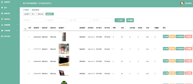 管理员点击商品信息,在商品信息页面输入商品编号、商品名称、商品分类、商品图片、商品规格、发布时间、用户账号、用户姓名、单限、库存、点击次数、评论数、价格、收藏数等信息,可以搜索或者删除商品信息等处理。如图5-11所示: