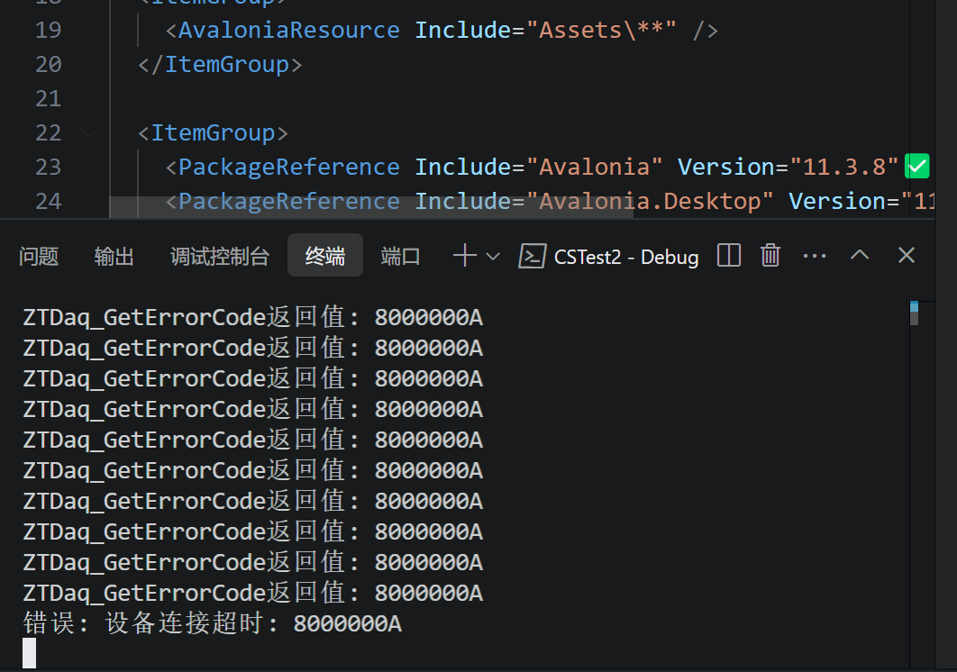 本篇文章完成后软件基本能用了,可以调用ztdaq函数,并且返回错误信息显示在终端中,如下图所示:
