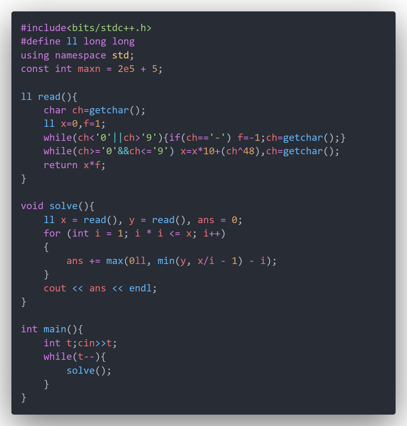 换句话说,b的上限是 min(y, x / k - 1),b的下限是k + 1,对于这其中任意一个整数b,均存在对应的a使得等式成立。所以跑一遍枚举即可。