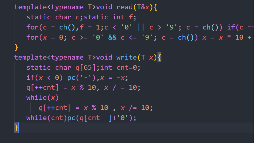 有时我们会遇到一些重复性很高的代码片段,以下我以快读和快写代码作为样例: