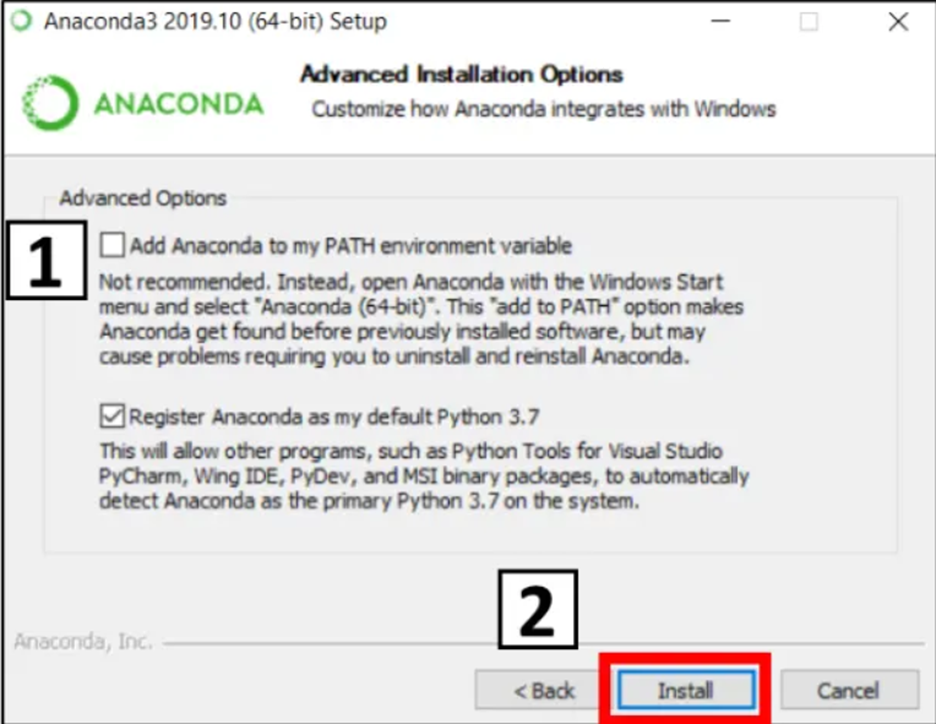 运行到这一步时要注意勾选1 Add Anaconda to my PATH environment variable,这样python调用你的包就只会访问anaconda中的环境,不必担心在anaconda中下载了包而不知道如何导入的问题。