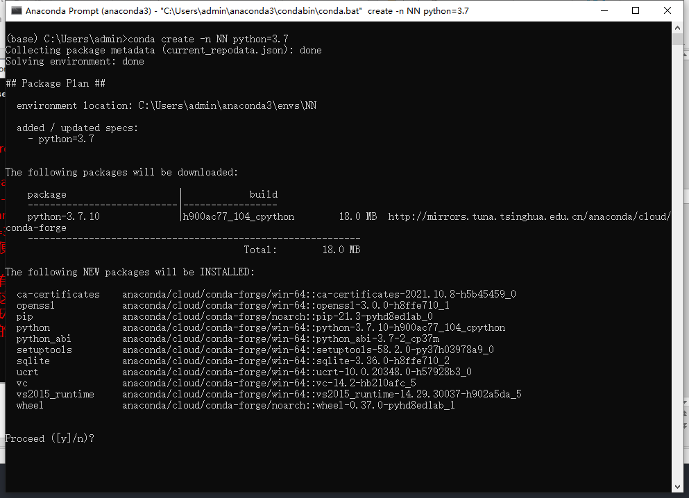 命令解释:conda是在anaconda中输入命令时的第一个单词,所有命令都以这个为开头,create代表你要创建虚拟环境,-n 和 NN是在一起,代表名字是NN,当然你也可以把NN改成你想要的名字,最后指定python版本。(一定要python3.7,版本高了会报错)