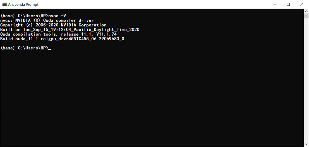 验证CUDA是否安装,在Anaconda Prompt中输入nvcc -V即可: