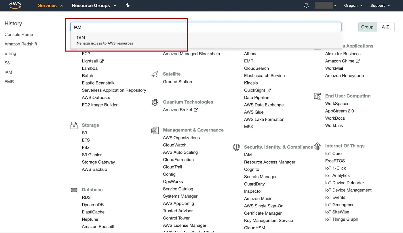 在 AWS 控制台中,单击Service,输入“IAM”转到 IAM 控制台:![]()