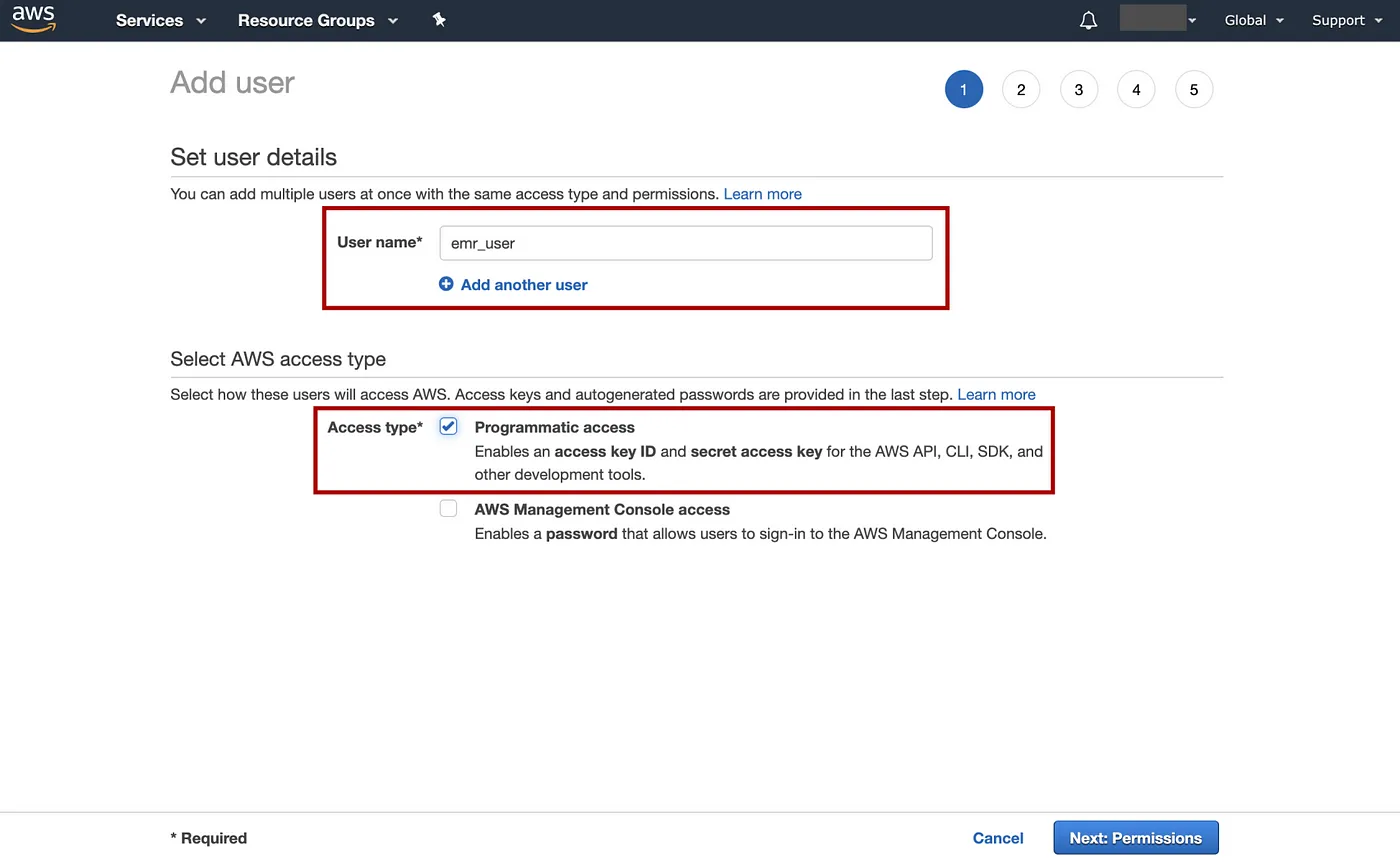 => 选择User=> Add user=> 输入用户名例如“emr_user”,选择Access type为程序访问,然后Next: Permissions。