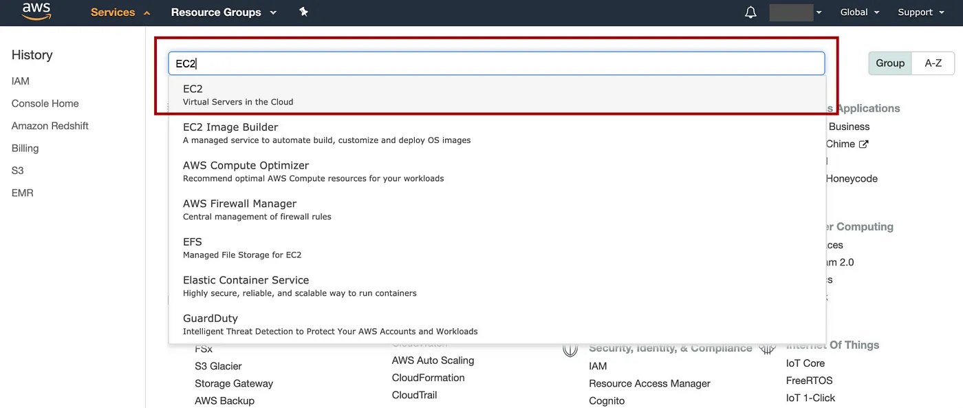 在 AWS 控制台中,单击“服务”,输入“EC2”以转到 EC2 控制台
