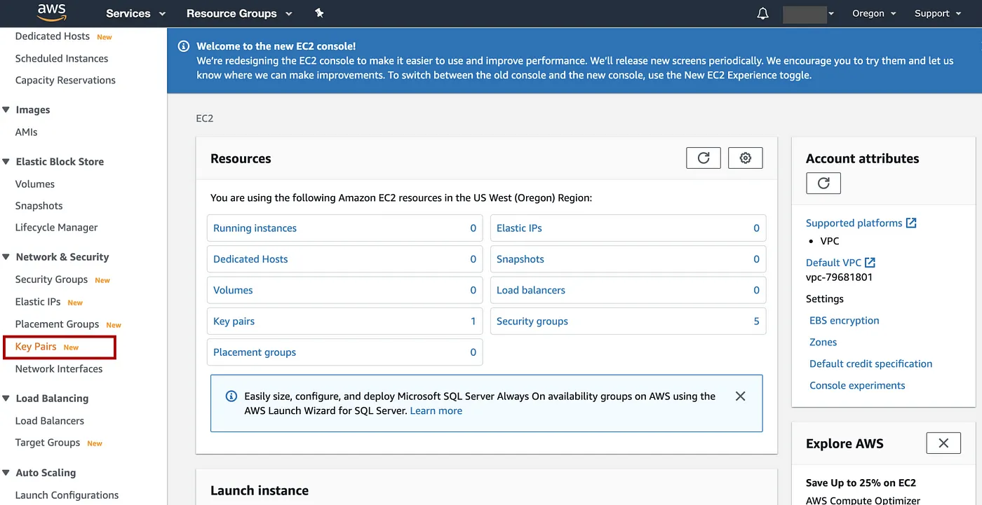 在左侧面板中Key Pairs选择“网络和安全” => 选择Create key pair