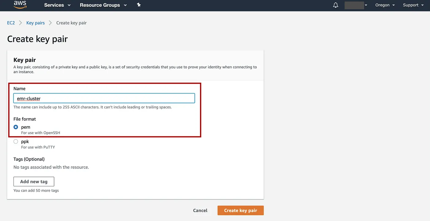输入密钥对的名称,例如“emr-cluster”,文件格式:pem => 选择Create key pair。完成此步骤后,将自动下载一个 .pem 文件,本例中文件名为emr_cluster.pem。我们将在步骤 6 中使用此文件。