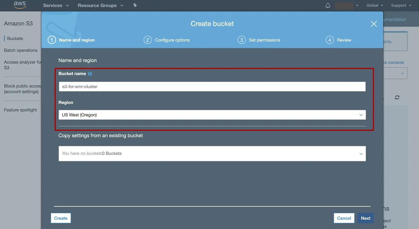 在 AWS 控制台中,单击Service,键入“S3”并转到 S3 控制台 => 选择Create bucket=> 输入存储桶的名称(例如“s3-for-emr-cluster”),选择您喜欢的区域,例如“美国西部(俄勒冈州)”。保留其他选项的默认设置以创建存储桶。