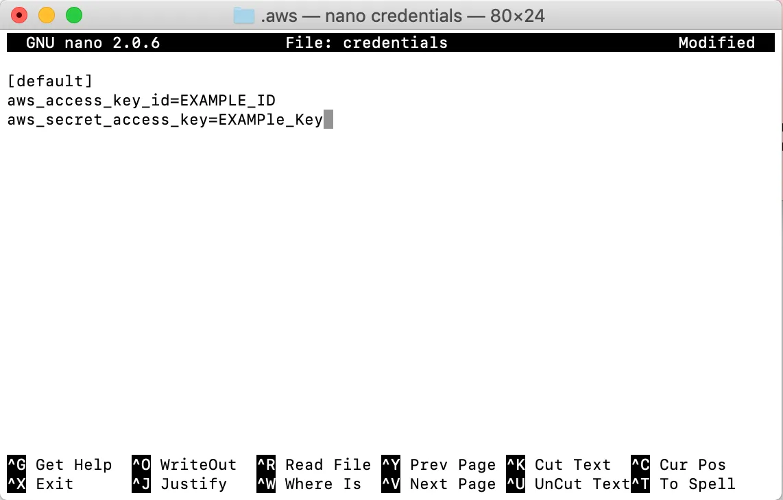 credentials使用 nano创建文件:$nano credentials输入文件内容credentials如下(将密钥“EXAMPLE_ID”和密钥“EXAMPle_Key”替换为步骤 2 中为用户“emr-user”生成的密钥):