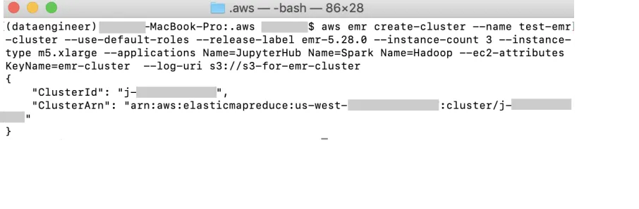 aws emr create-cluster --name test-emr-cluster --use-default-roles --release-label emr-5.28.0 --instance-count 3 --instance-type m5.xlarge --applications Name=JupyterHub Name=Spark Name=Hadoop --ec2-attributes KeyName=emr-cluster --log-uri s3://s3-for-emr-cluster/