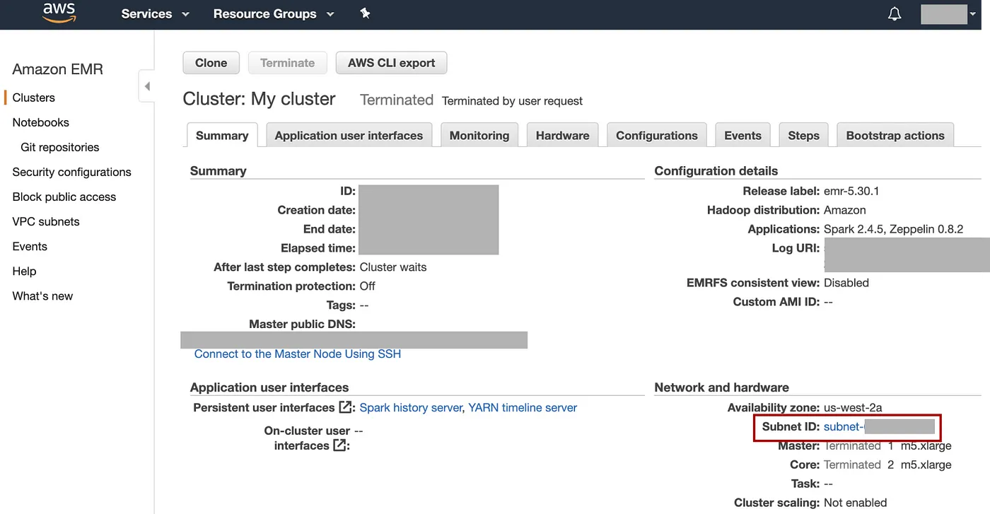 对于初学者来说,另一种安全的方法:使用 AWS 控制台创建类似的 EMR 集群。然后查看该集群的“摘要”页面上的“网络和硬件”会话以查看子网 ID: