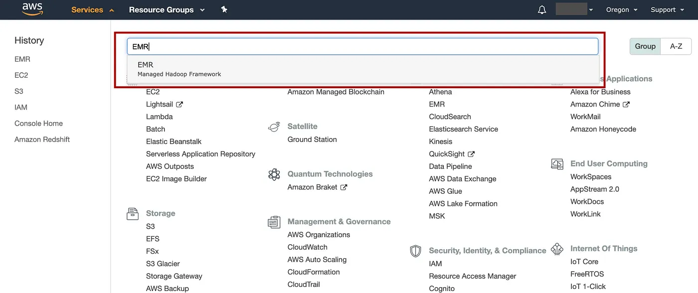 在 AWS 控制台中,单击Service,输入 EMR,然后转到 EMR 控制台。