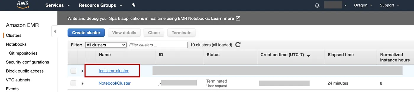 => 选择Clusters=> 在列表中选择集群的名称,在本例中为test-emr-cluster