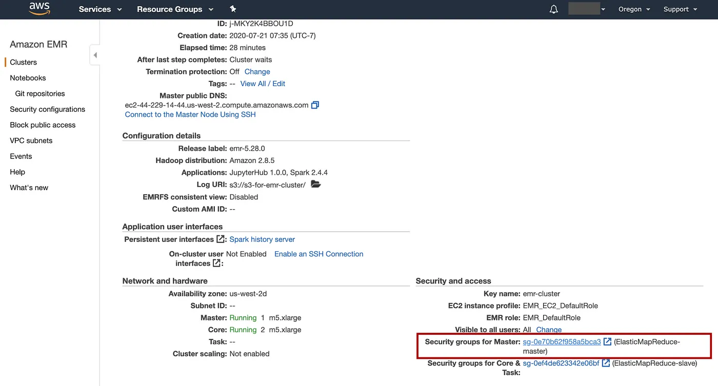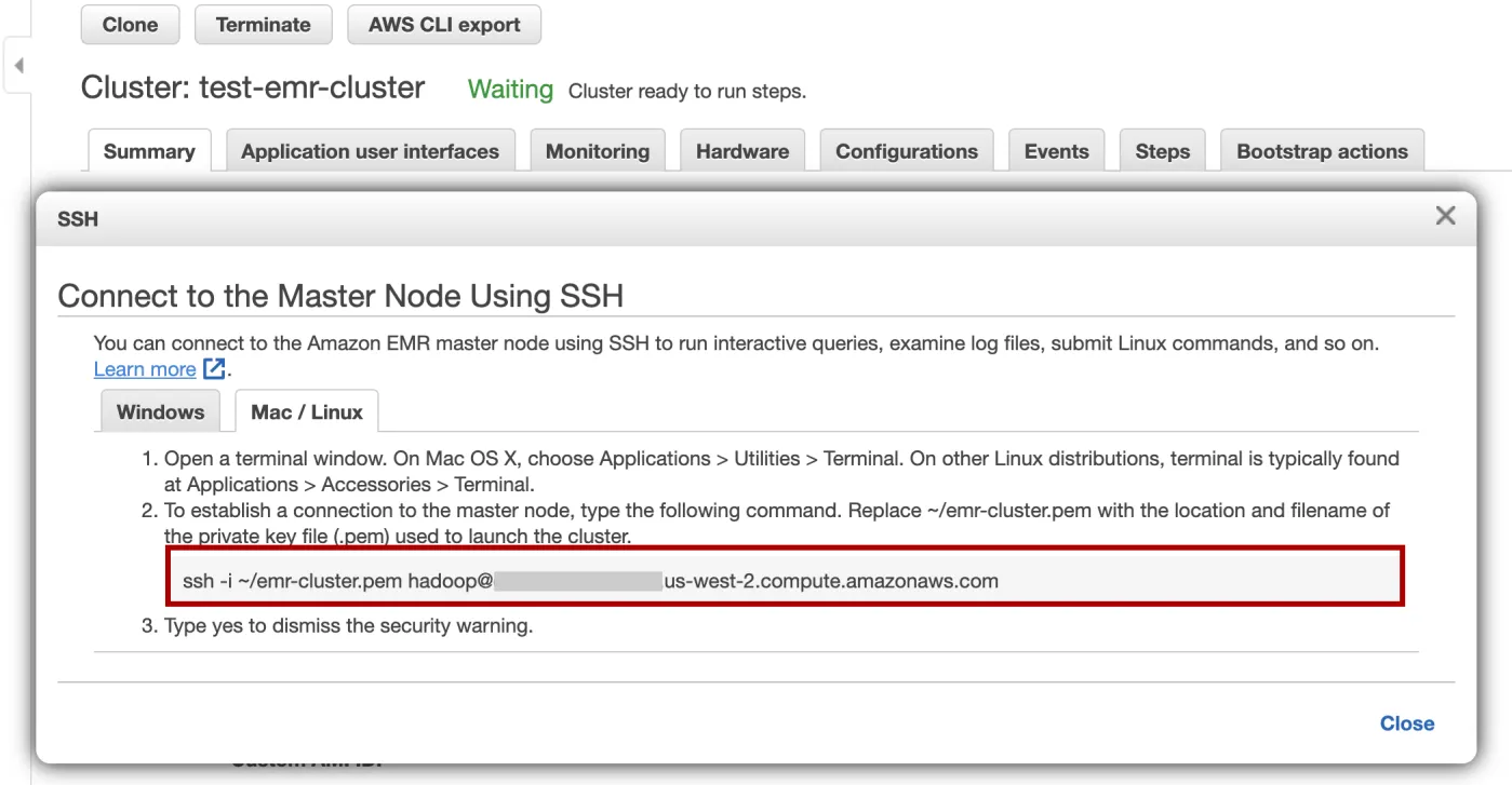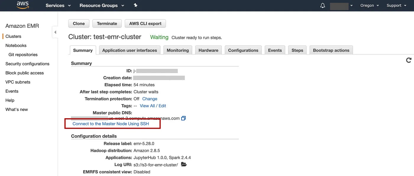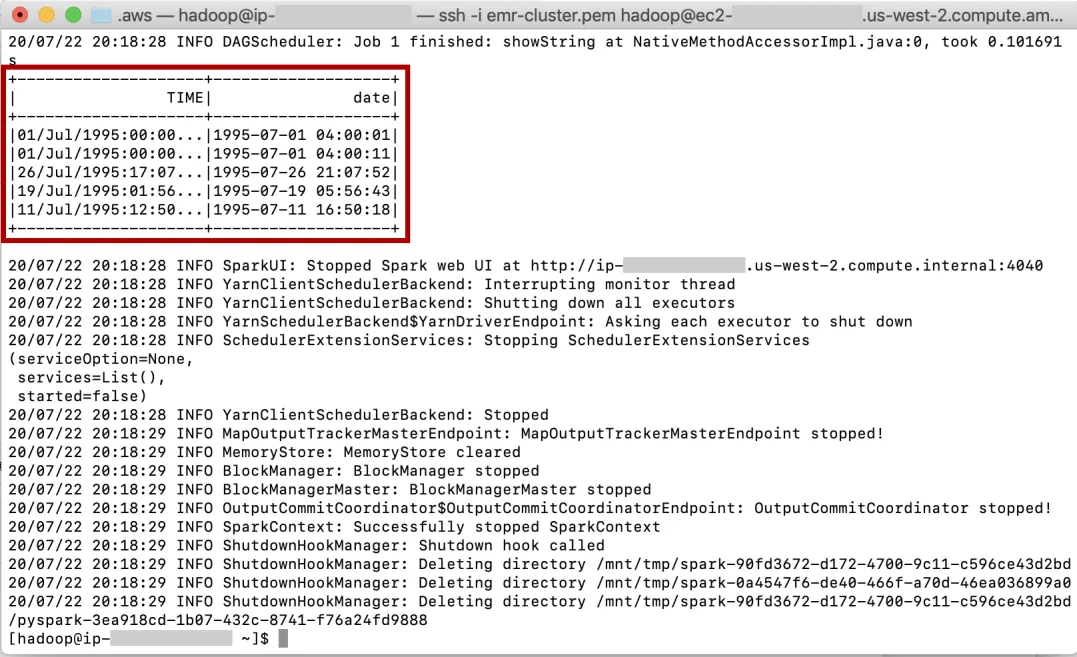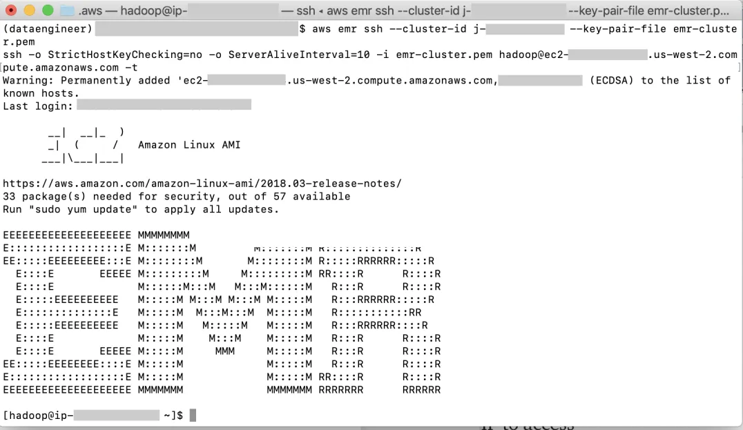 ssh -i ~/.aws/emr-cluster.pem hadoop@ec2-xx-xxx-xx-xx.us-west-2.compute.amazonaws.com