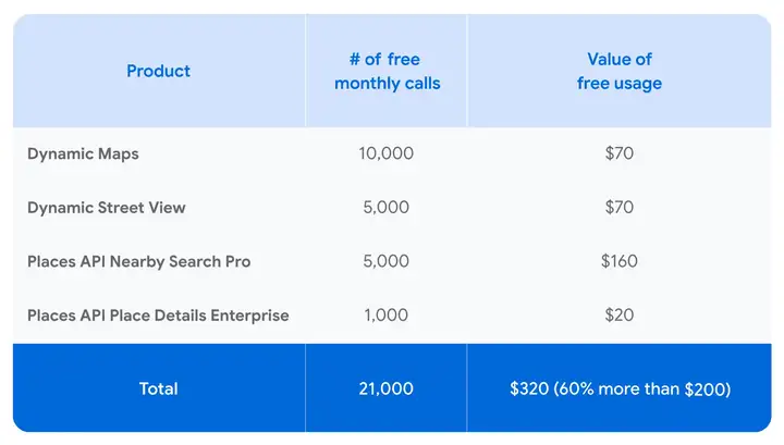 您从使用中获得的价值取决于您使用的 Google Maps Platform 产品和您每月调用次数。此示例展示了开发人员如何使用这五款 Google Maps Platform 产品获得价值320 美元的免费使用量。您每月最多可以获得价值3,250 美元的免费使用量,这些免费使用量分布在所有 Google Maps Platform 产品中。免费使用量的价值是根据开发人员在不适用每月免费使用量的情况下需要支付的费用计算得出的。