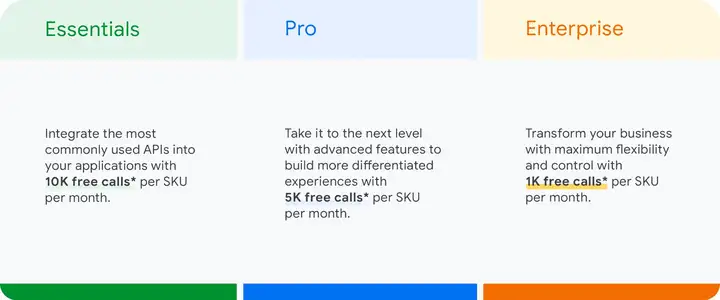 答:我们并没有改变我们产品的定价。事实上,我们现在提供每个产品每月的免费使用量,以便开发人员可以免费试用我们的更多产品。对于 Essentials,您可以获得每个 SKU 每月 10K 次免费调用,对于 Pro,您可以获得每个 SKU 每月 5K 次免费调用,对于 Enterprise,您可以获得每个 SKU 每月 1K 次免费调用。2新的免费套餐旨在让您更轻松、更经济高效地使用我们的产品进行测试和构建。而且,您每月最多可以获得价值 3,250 美元的免费使用量,分布在我们所有的产品中,而不是之前每月固定的 200 美元信用额度。