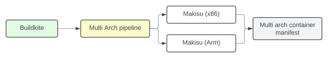 这个新的流水线将构建过程多路复用到 Arm 和 x86 主机上,在每个架构上本地运行 Makisu。