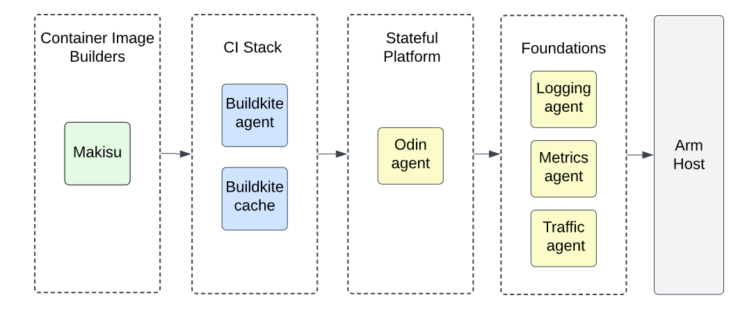Bazel 加入构建流程后,我们可以构建出 Arm 版 Makisu。但 Makisu 运行在 Buildkite CI 系统上,而 Buildkite 又依赖我们名为 Odin 的 Stateful 平台。