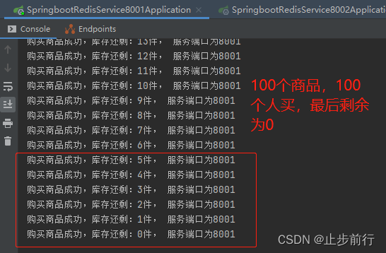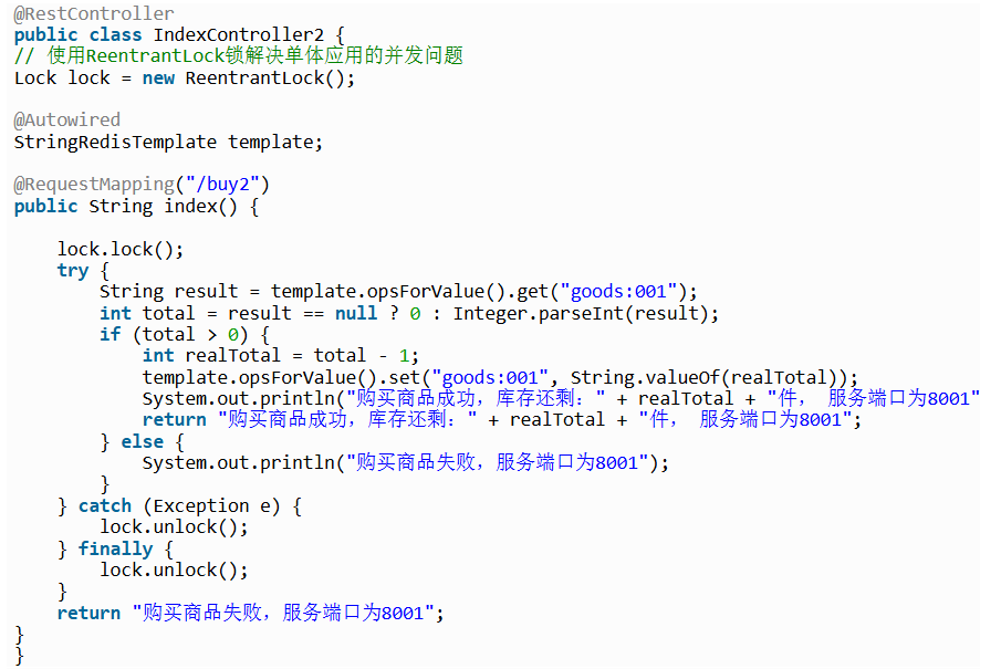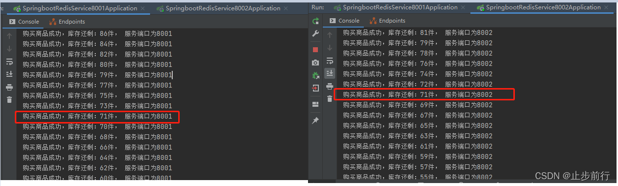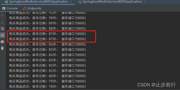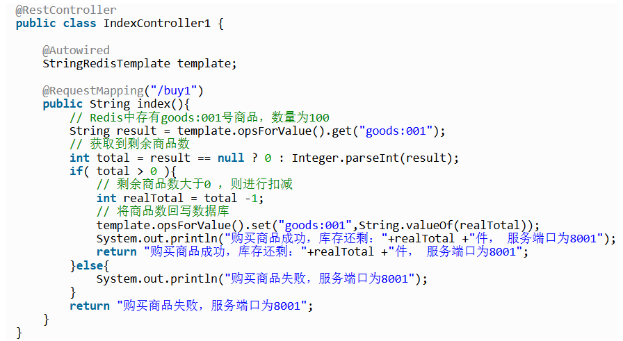 System.out.println("购买商品成功,库存还剩:" + realTotal + "件, 服务端口为8001");