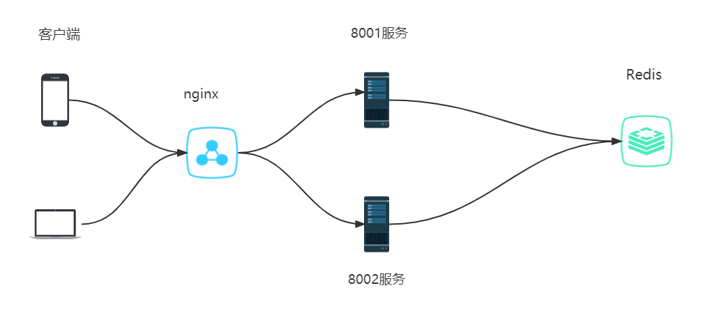 提供两个服务,端口分别为8001、8002,连接同一个Redis服务,在服务前面有一台Nginx作为负载均衡