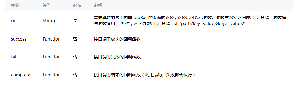注意点:1、url 需要跳转的应用内非 tabBar 的页面的路径