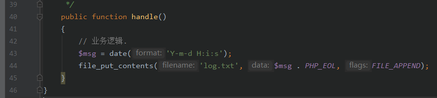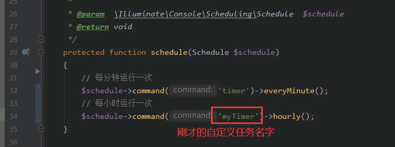 ->cron('* * * * *'); 自定义 Cron 计划执行任务 ->everyMinute(); 每分钟执行一次任务 ->everyFiveMinutes(); 每五分钟执行一次任务 ->everyTenMinutes(); 每十分钟执行一次任务 ->everyFifteenMinutes(); 每十五分钟执行一次任务 ->everyThirtyMinutes(); 每三十分钟执行一次任务 ->hourly(); 每小时执行一次任务 ->hourlyAt(17); 每小时第 17 分钟执行一次任务 ->daily(); 每天午夜执行一次任务(译者注:每天零点) ->dailyAt('13:00'); 每天 13 点执行一次任务 ->twiceDaily(1, 13); 每天 1 点及 13 点各执行一次任务 ->weekly(); 每周执行一次任务 ->weeklyOn(1, '8:00'); 每周一的 8 点执行一次任务 ->monthly(); 每月执行一次任务 ->monthlyOn(4, '15:00'); 每月 4 号的 15 点 执行一次任务 ->quarterly(); 每季度执行一次任务 ->yearly(); 每年执行一次任务 ->timezone('America/New_York'); 设置时区 // 限制条件 ->weekdays(); 限制任务在工作日执行 ->weekends(); 限制任务在周末执行 ->sundays(); 限制任务在周日执行 ->mondays(); 限制任务在周一执行 ->tuesdays(); 限制任务在周二执行 ->wednesdays(); 限制任务在周三执行 ->thursdays(); 限制任务在周四执行 ->fridays(); 限制任务在周五执行 ->saturdays(); 限制任务在周六执行 ->between($start, $end); 限制任务在 $start 和 $end 区间执行 ->when(Closure); 限制任务在闭包返回为真时执行 ->environments($env); 限制任务在特定环境中执行