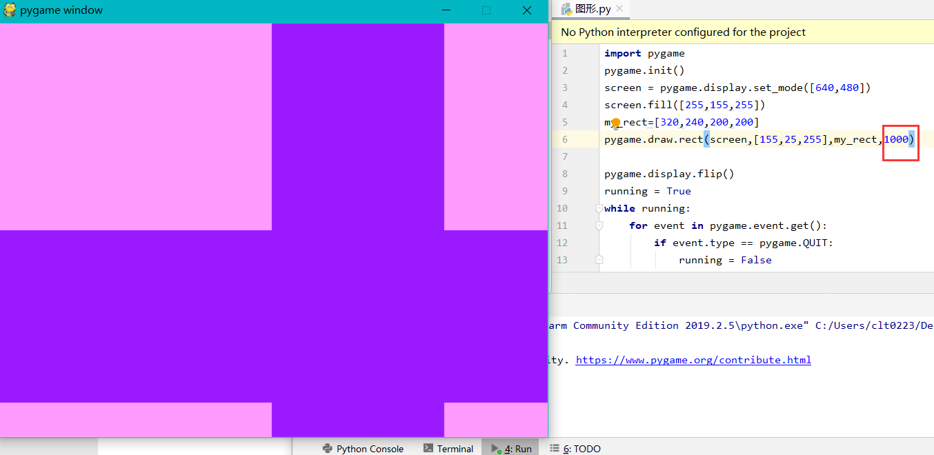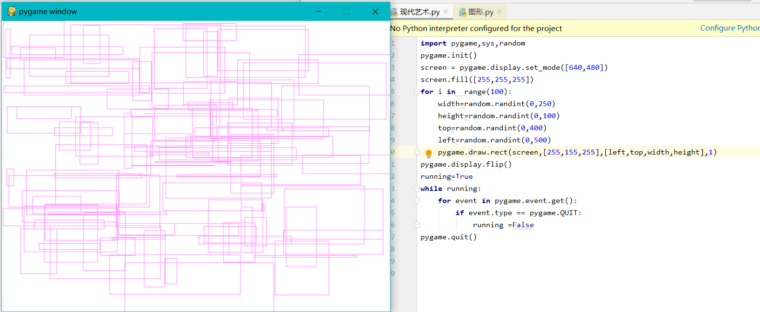 pygame.draw.rect(screen,[155,25,255],[320,240,200,200],0)#画矩形