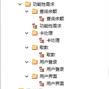 (3)为需求模型添加两个包:功能性需求与非功能性需求,在功能性需求下添加子包:用户界面,用户登录,取款,卡处理,查询余额。