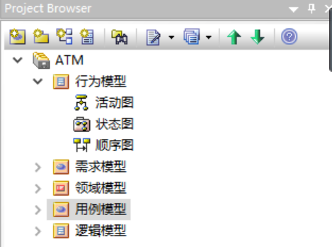 (7)在ATM包下添加视图,命名为行为模型,并在该模型下添加活动图,状态图和顺序图。