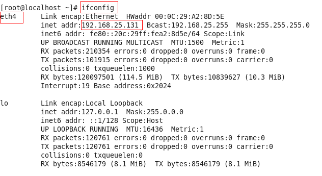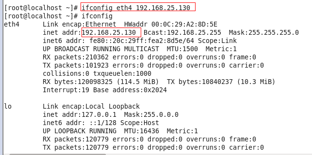 2.修改命令:ifconfig eth4 192.168.25.130 其中eth4 是网卡名
