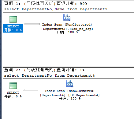 示例1:Department表,总数据量200行,只有索引:CREATE NONCLUSTERED INDEX idx_nc_dep ON Department(DepartmentNo,Name)