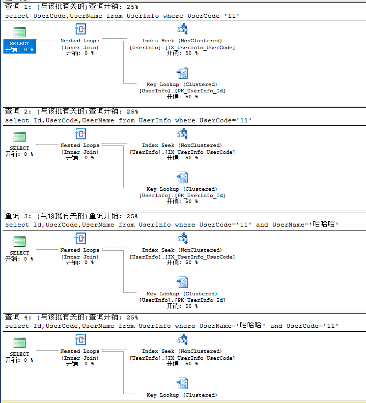 如UserInfpp表,总数据量10万行,Id为主键,非聚集索引UserCode :select Id,UserCode,UserName from UserInfo where Id='11'