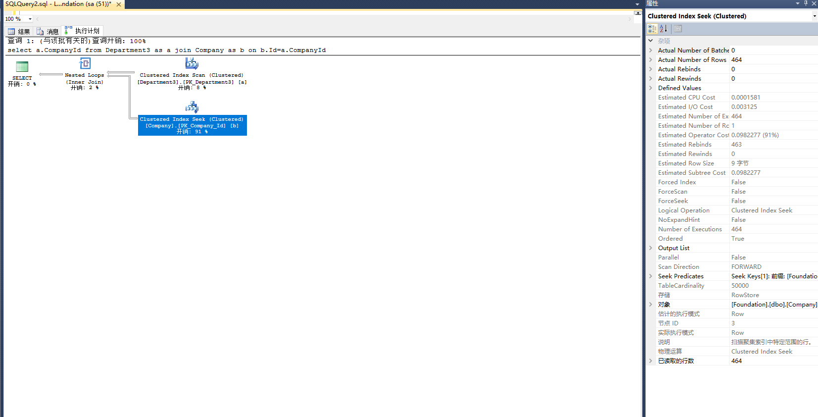 下图:外部表Department3表,数据464总行数;主键Id;内部表Company,数据10万行,主键Id,非聚集索引CompanyNo;