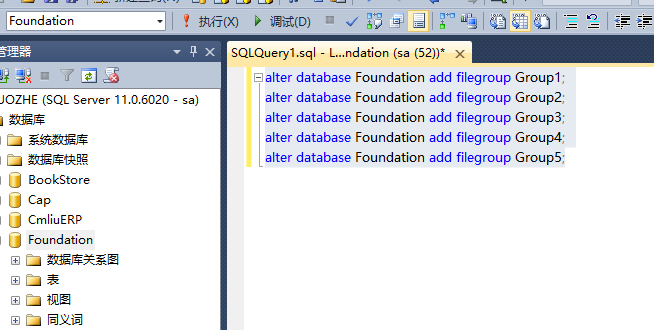 1,给数据库添加文件组;如下给Foundation数据库添加5个文件组